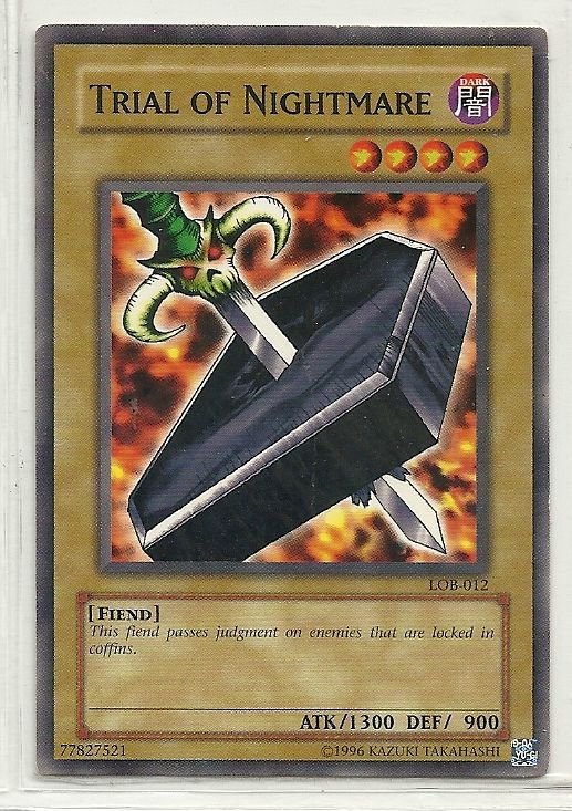 more Great cards @ www.everythingcollectibles.biz For Sale is a YuGiOh Legend of Blue Eyes White Dragon Single Card Common LOB-012 Trial of Nightmare. all single cards are shipped in Penny Sleeves and top loaders. all orders ship with delivery confirmation as well. we usually ship within 2 days of receiving an order. Shipping is a