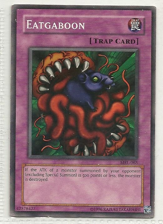 more Great cards @ www.everythingcollectibles.biz For Sale is a YuGiOh Magic Ruler Single Card Common MRL-065 Eatgaboon. all single cards are shipped in Penny Sleeves and top loaders. all orders ship with delivery confirmation as well. we usually ship within 2 days of receiving an