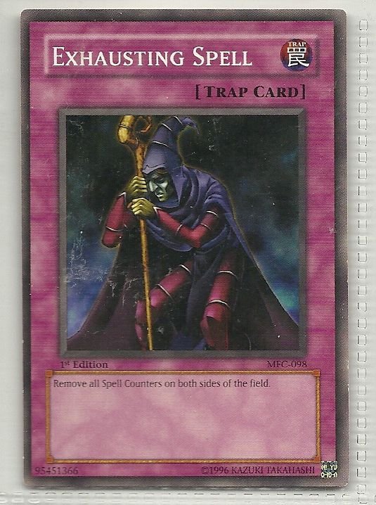 more Great cards @ www.everythingcollectibles.biz For Sale is a YuGiOh Magician's Force Single Card Common MFC-098 Exhausting Spell. all single cards are shipped in Penny Sleeves and top loaders. all orders ship with delivery confirmation as well. we usually