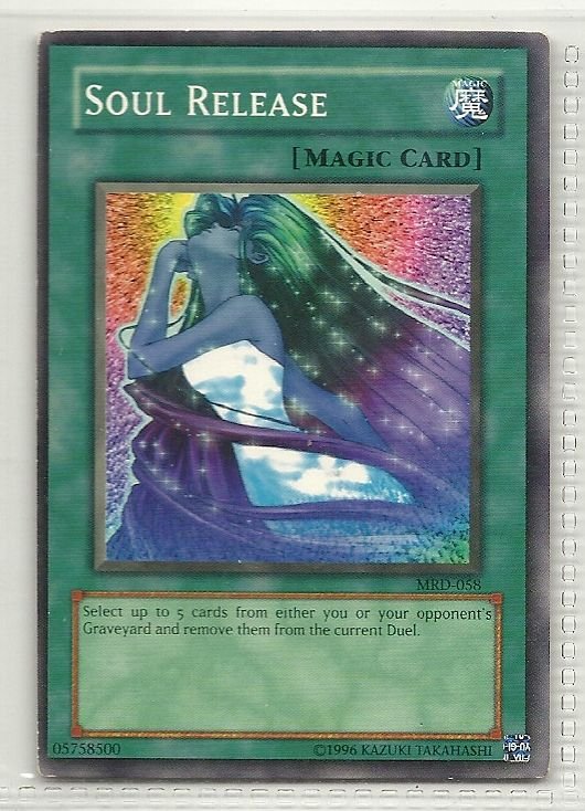 more Great cards @ www.everythingcollectibles.biz For Sale is a YuGiOh Metal Raiders Single Card Common MRD-058 Soul Release. all single cards are shipped in Penny Sleeves and top loaders. all orders ship with delivery confirmation as w
