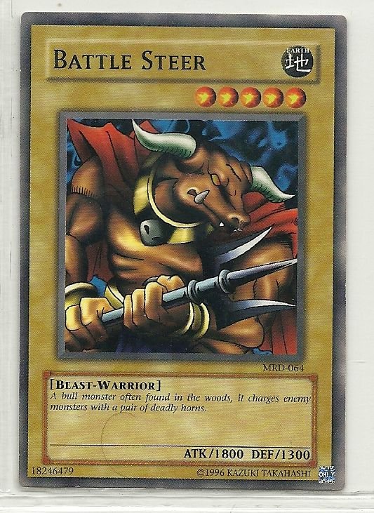 more Great cards @ www.everythingcollectibles.biz For Sale is a YuGiOh Metal Raiders Single Card Common MRD-064 Battle Steer. all single cards are shipped in Penny Sleeves and top loaders. all orders ship with delivery confirmation as