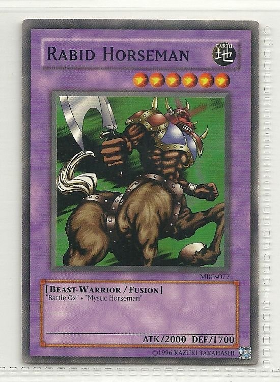 more Great cards @ www.everythingcollectibles.biz For Sale is a YuGiOh Metal Raiders Single Card Common MRD-077 Rabid Horseman. all single cards are shipped in Penny Sleeves and top loaders. all orders ship with delivery confirmation as