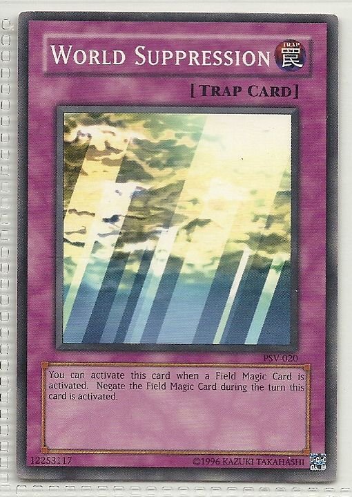 more Great cards @ www.everythingcollectibles.biz For Sale is a YuGiOh Pharaoh's Servant Single Card Common PSV-020 World Suppression. all single cards are shipped in Penny Sleeves and top loaders. all orders ship with delivery confirmation as
