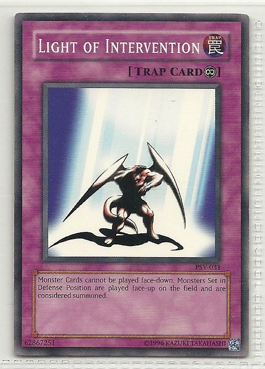 more Great cards @ www.everythingcollectibles.biz For Sale is a YuGiOh Pharaoh's Servant Single Card Common PSV-031 Light of Intervention. all single cards are shipped in Penny Sleeves and top loaders. all orders ship with delivery confirmation as