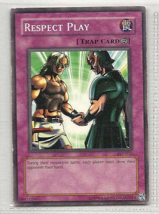 more Great cards @ www.everythingcollectibles.biz For Sale is a YuGiOh Pharaoh's Servant Single Card Common PSV-032 Respect Play. all single cards are shipped in Penny Sleeves and top loaders. all orders ship with delivery confirmation as