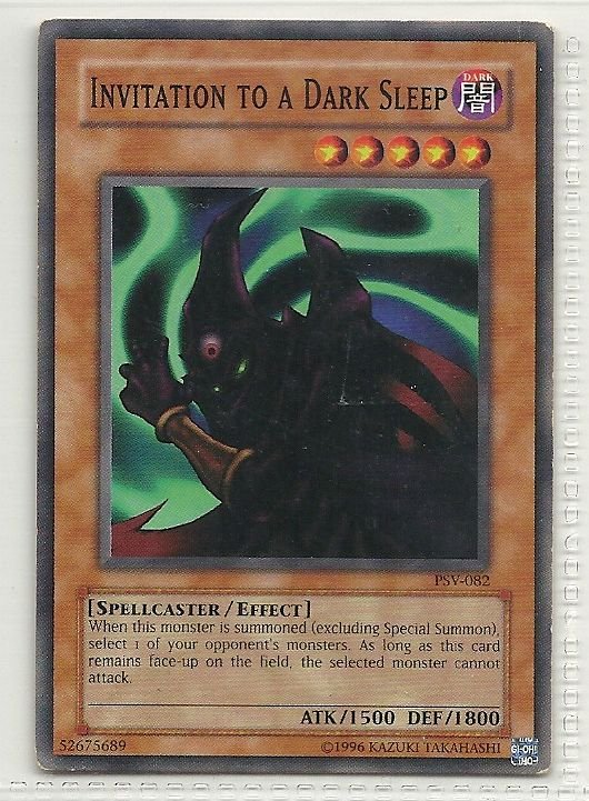 more Great cards @ www.everythingcollectibles.biz For Sale is a YuGiOh Pharaoh's Servant Single Card Common PSV-082 Invitation to a Dark Sleep. all single cards are shipped in Penny Sleeves and top loaders. all orders ship with delivery confirmation