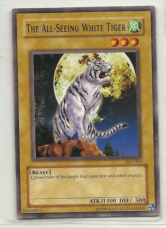 more Great cards @ www.everythingcollectibles.biz For Sale is a YuGiOh Pharaoh's Servant Single Card Common PSV-093 The All-Seeing White Tiger. all single cards are shipped in Penny Sleeves and top loaders. all orders ship with delivery confirmation