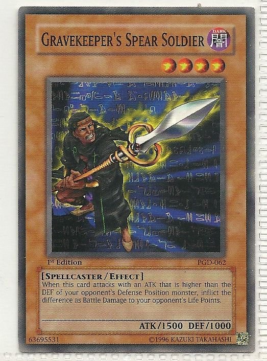 more Great cards @ www.everythingcollectibles.biz For Sale is a YuGiOh Pharaonic Guardian Single Card Common PGD-062 Gravekeeper's Spear Soldier. all single cards are shipped in Penny Sleeves and top loaders. all orders ship with delivery confirmation