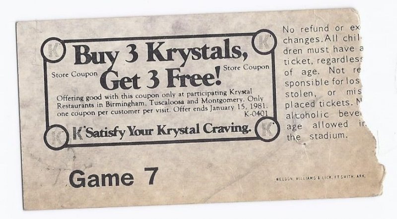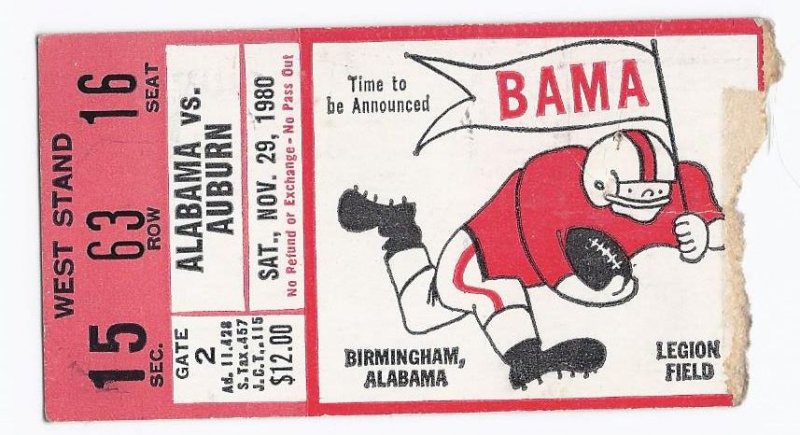 1980 Iron Bowl Game Ticket Stub Alabama Auburn Nov 29th