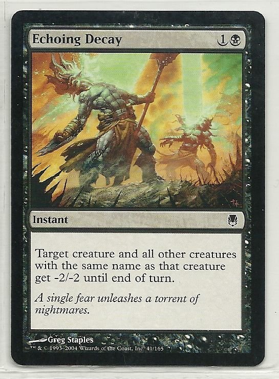 more Great cards @ www.everythingcollectibles.biz For Sale is a MTG Magic The Gathering Darksteel Echoing Decay Card Common in Very Good to NrMt Condition as pictured. all single cards are shipped in Penny Sleeves and top loaders. all orders ship with delivery confirmation as well. we usually ship within 2 days of receiving an order. Shipping is a Flat $2 no matter how many cards you buy 1 or 1000 its sti