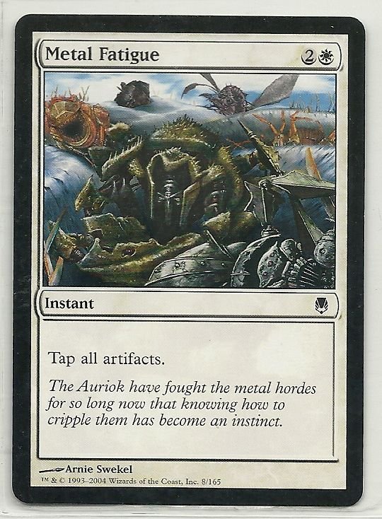 more Great cards @ www.everythingcollectibles.biz For Sale is a MTG Magic The Gathering Darksteel Metal Fatigue Card Common in Very Good to NrMt Condition as pictured. all single cards are shipped in Penny Sleeves and top loaders. all orders ship with delivery confirmation as well. we usually ship within 2 days of receiving an order. Shipping is a Flat $2 no matter how many cards you buy 1 or 1000 its sti