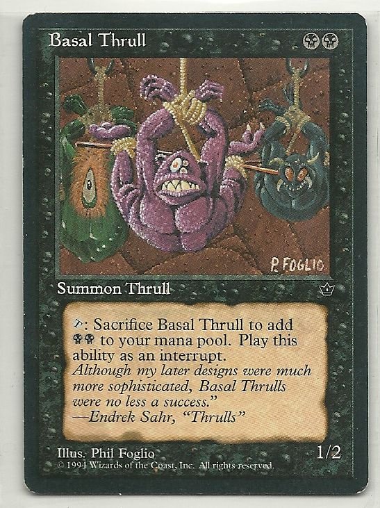 more Great cards @ www.everythingcollectibles.biz For Sale is a MTG Magic The Gathering Fallen Empires Basal Thrull Card Common in Very Good to NrMt Condition as pictured. all single cards are shipped in Penny Sleeves and top loaders. all orders ship with delivery confirmation as well. we usually ship within 2 days of receiving an order. Shipping is a Flat $2 no matter how many cards you buy 1 or 1000 its sti