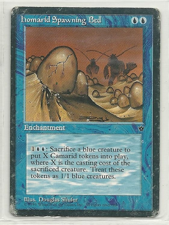more Great cards @ www.everythingcollectibles.biz For Sale is a MTG Magic The Gathering Fallen Empires Homarid Spawning Bed Card Uncommon in Very Good to NrMt Condition as pictured. all single cards are shipped in Penny Sleeves and top loaders. all orders ship with delivery confirmation as well. we usually ship within 2 days of receiving an order. Shipping is a Flat $2 no matter how many cards you buy 1 or 1000 its sti