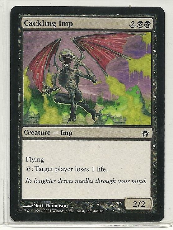 more Great cards @ www.everythingcollectibles.biz For Sale is a MTG Magic The Gathering Fifth Dawn Cackling Imp Card Common in Very Good to NrMt Condition as pictured. all single cards are shipped in Penny Sleeves and top loaders. all orders ship with delivery confirmation as well. we usually ship within 2 days of receiving an order. Shipping is a Flat $2 no matter how many cards you buy 1 or 1000 its sti