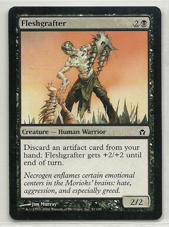 more Great cards @ www.everythingcollectibles.biz For Sale is a MTG Magic The Gathering Fifth Dawn Fleshgrafter Card Common in Very Good to NrMt Condition as pictured. all single cards are shipped in Penny Sleeves and top loaders. all orders ship with delivery confirmation as well. we usually ship within 2 days of receiving an order. Shipping is a Flat $2 no matter how many cards you buy 1 or 1000 its sti