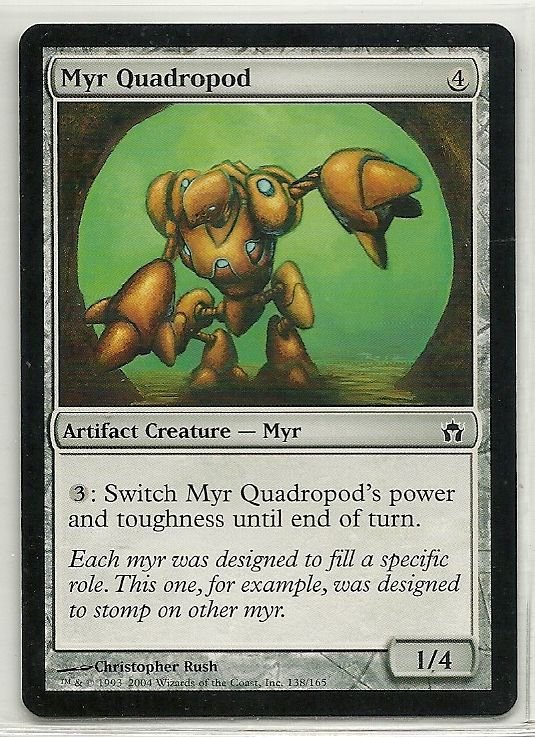 more Great cards @ www.everythingcollectibles.biz For Sale is a MTG Magic The Gathering Fifth Dawn Myr Quadropod Card Common in Very Good to NrMt Condition as pictured. all single cards are shipped in Penny Sleeves and top loaders. all orders ship with delivery confirmation as well. we usually ship within 2 days of receiving an order. Shipping is a Flat $2 no matter how many cards you buy 1 or 1000 its sti