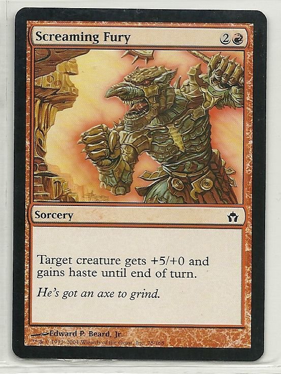 more Great cards @ www.everythingcollectibles.biz For Sale is a MTG Magic The Gathering Fifth Dawn Screaming Fury Card Common in Very Good to NrMt Condition as pictured. all single cards are shipped in Penny Sleeves and top loaders. all orders ship with delivery confirmation as well. we usually ship within 2 days of receiving an order. Shipping is a Flat $2 no matter how many cards you buy 1 or 1000 its sti