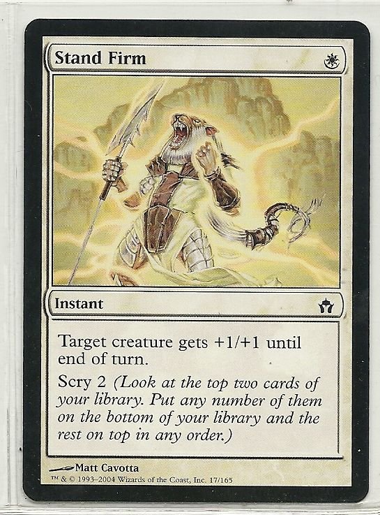 more Great cards @ www.everythingcollectibles.biz For Sale is a MTG Magic The Gathering Fifth Dawn Stand Firm Card Common in Very Good to NrMt Condition as pictured. all single cards are shipped in Penny Sleeves and top loaders. all orders ship with delivery confirmation as well. we usually ship within 2 days of receiving an order. Shipping is a Flat $2 no matter how many cards you buy 1 or 1000 its sti