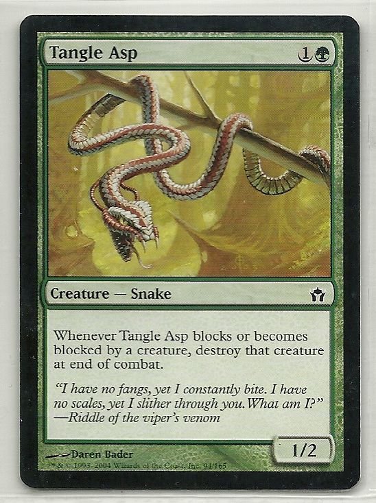 more Great cards @ www.everythingcollectibles.biz For Sale is a MTG Magic The Gathering Fifth Dawn Tangle Asp Card Common in Very Good to NrMt Condition as pictured. all single cards are shipped in Penny Sleeves and top loaders. all orders ship with delivery confirmation as well. we usually ship within 2 days of receiving an order. Shipping is a Flat $2 no matter how many cards you buy 1 or 1000 its sti