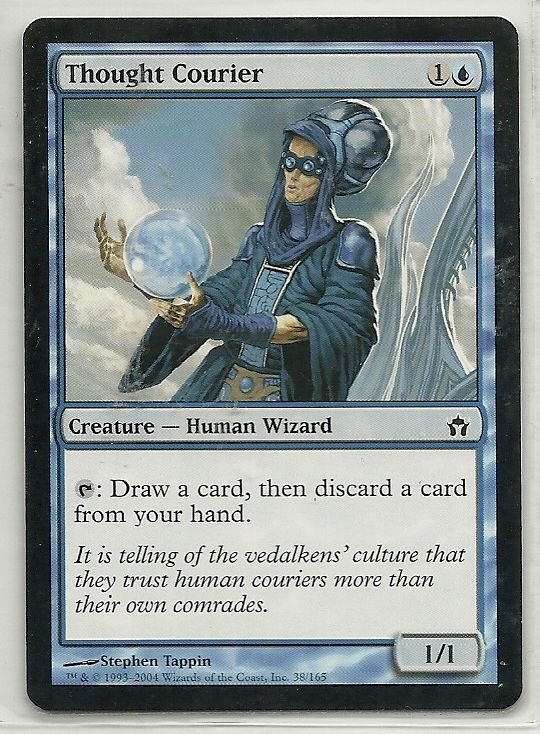 more Great cards @ www.everythingcollectibles.biz For Sale is a MTG Magic The Gathering Fifth Dawn Thought Courier Card Common in Very Good to NrMt Condition as pictured. all single cards are shipped in Penny Sleeves and top loaders. all orders ship with delivery confirmation as well. we usually ship within 2 days of receiving an order. Shipping is a Flat $2 no matter how many cards you buy 1 or 1000 its sti