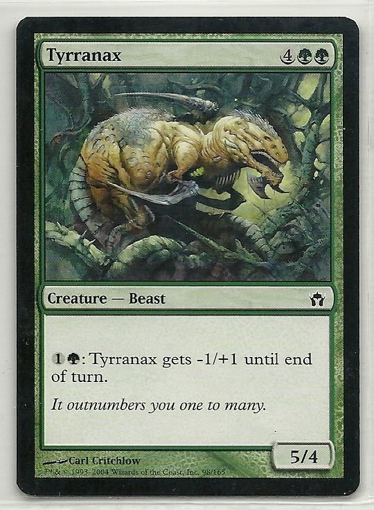 more Great cards @ www.everythingcollectibles.biz For Sale is a MTG Magic The Gathering Fifth Dawn Tyrranax Card Common in Very Good to NrMt Condition as pictured. all single cards are shipped in Penny Sleeves and top loaders. all orders ship with delivery confirmation as well. we usually ship within 2 days of receiving an order. Shipping is a Flat $2 no matter how many cards you buy 1 or 1000 its sti