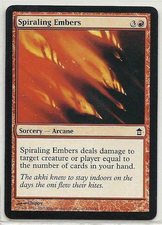 more Great cards @ www.everythingcollectibles.biz For Sale is a MTG Magic The Gathering Saviors of Kamigawa Spiraling Embers Card Common in Very Good to NrMt Condition as pictured. all single cards are shipped in Penny Sleeves and top loaders. all orders ship with delivery confirmation as well. we usually ship within 2 days of