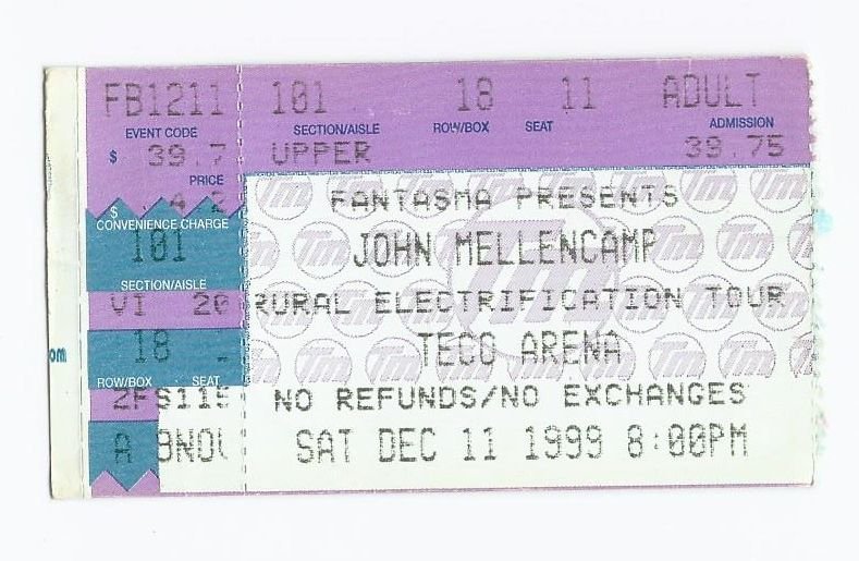 more great collectibles @ www.everythingcollectibles.biz for sale is a rare 1998 John Mellencamp Concert Ticket Stub December 11th Teco Arena Fort Myers Fl. the Seating Capacity in this arena is ONLY 8,284. ticket is in very good condition no rips tears or writing on the ticket. just some minor handling wear. what you see is what you will receive. if you would like additional pictures or a more detailed description please don't hesitate to ask