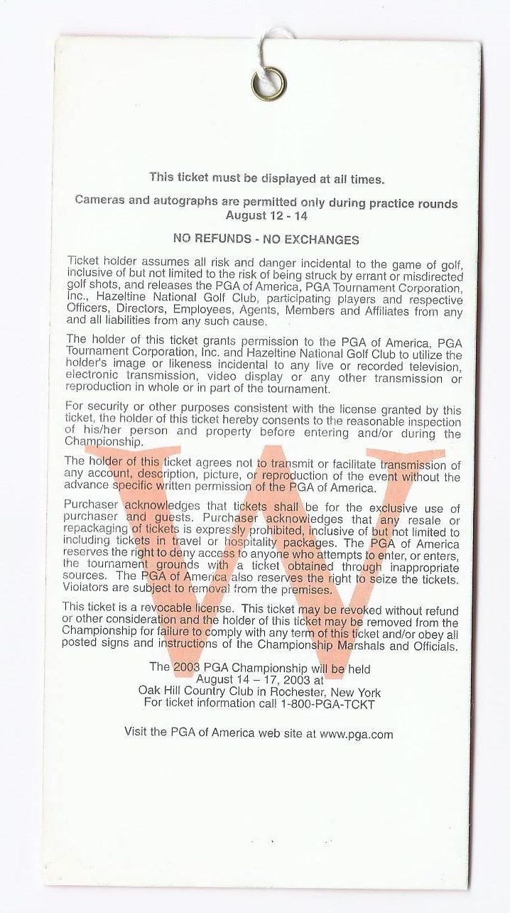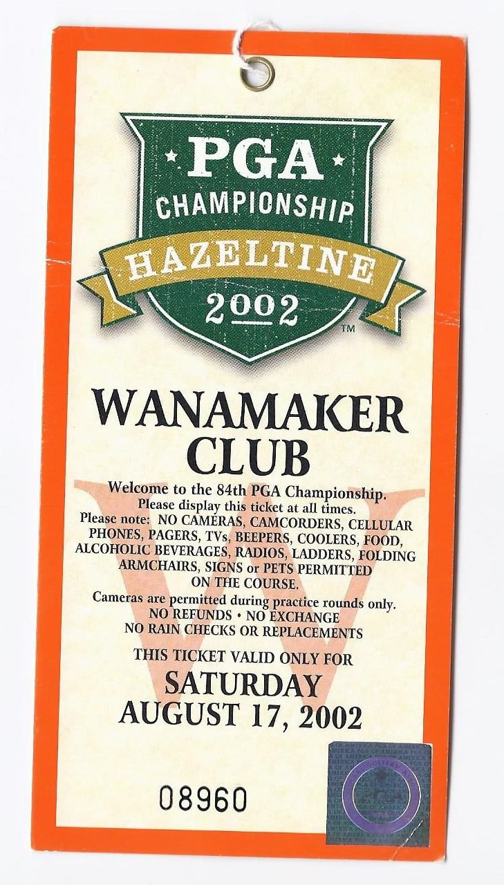 2002 PGA Championship Ticket 3rd Tournament Round Thursday 8 17 02. This Ticket is in Very Good Condition no rips tears writing or creasing on the ticket a RARE piece of Golf and US Open History if you have any further questions please dont hesitate to ask!