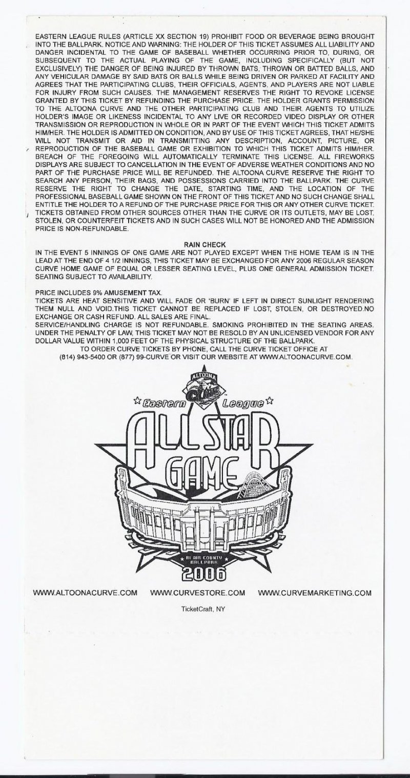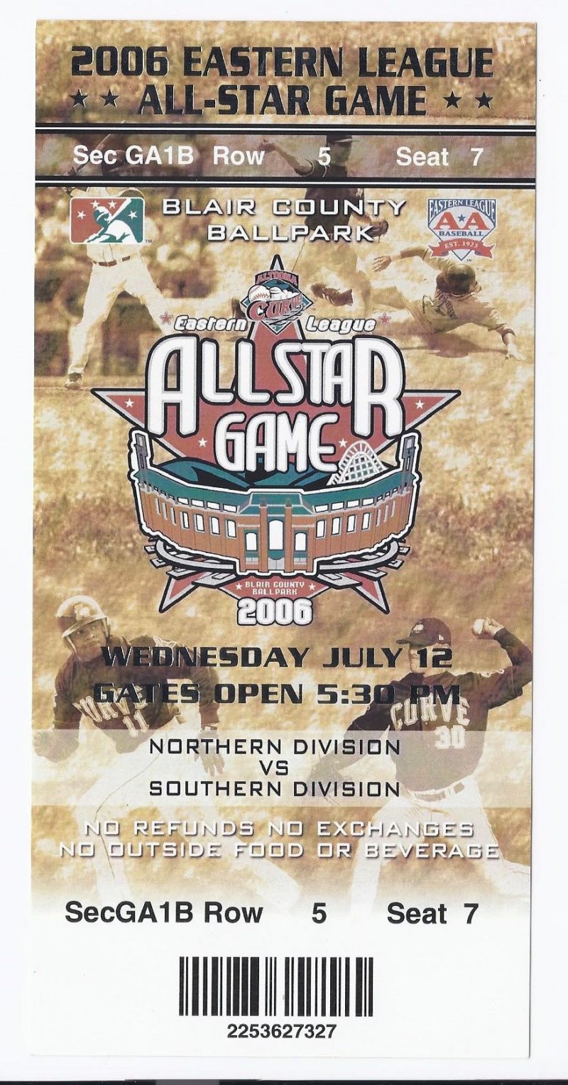 2006 Eastern League All Star Game Full Unused Ticket. it is in very good condition no writing or tears on the ticket but there does have some creasing still a nice RARE piece of Baseball History. if you have any further questio