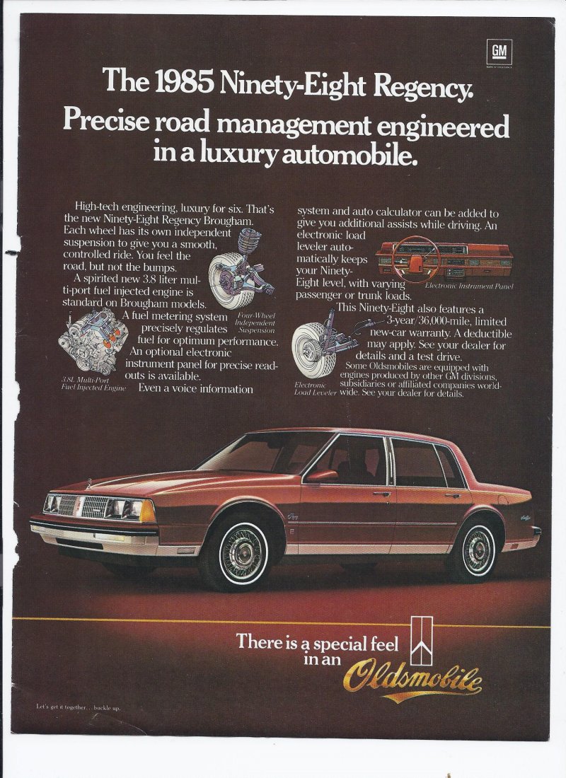 1985 Oldsmobile Ninety-Eight Regency Print Ad Automobile