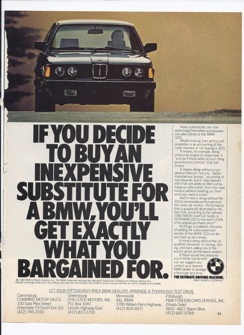 more great Print Ad's @ www.everything-collectibles.com for sale is a rare and hard to find 1982 BMW Print Ad Automobile car. In good used condition as pictured. If you have any questions please don't hesitate to ask. Fast same or next day shipping with delivery confirmation within the U.S. This Item Ships Free within the United States.