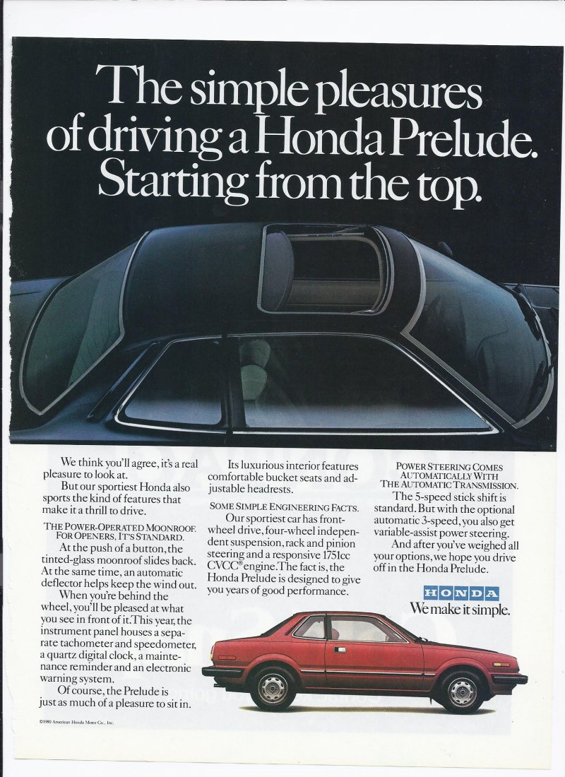 more great Print Ad's @ www.everythingcollectibles.biz for sale is a rare and hard to find 198o Honda Prelude Print Ad Automobile car. In good used condition as pictured. Fast same or next day shipping with delivery confirmation within the U.S.