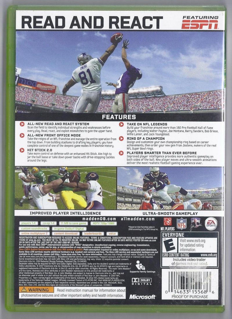 more great Video Games @ www.everything-collectibles.com Madden 08 Xbox 360 video game NFL Football 2008. This Video Game is in very good condition as you can see from the picture tested and works. if you have any further questions please dont hesitate to askk! Flat $5 shipping No Matter if you purchase 1 or 100 shipping is only $5 and if your order is over $50 Shipping is FREEE!!!