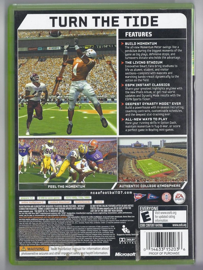 more great Video Games @ www.everything-collectibles.com NCAA 07 Xbox 360 video Game College Football 2007. This Video Game is in very good condition as you can see from the picture tested and works. if you have any further questions please don't hesitate to ask! if your order is over $50 Shipping is FREEE within The U.S.!!!