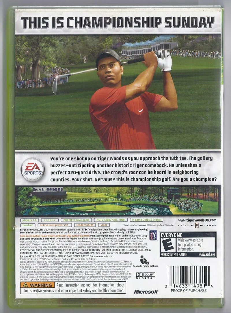 more great Video Games @ www.everything-collectibles.com Tiger Woods PGA Tour 06 xbox 360 video Game 2006. This Video Game is in very good condition as you can see from the picture tested and works. if you have any further questions please don't hesitate to ask! if your order is over $50 Shipping is FREEE within The U.S.!!!