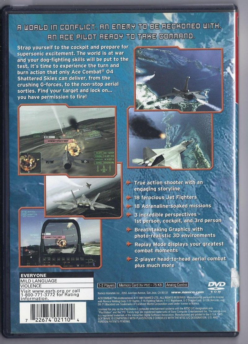 more great Video Games @ www.everything-collectibles.com Ace combat 04 shattered skies PS2 Game PlayStation 2002. This Video Game is in very good condition as you can see from the picture tested and works. if you have any further questions please don't hesitate to ask! if your order is over $50 Shipping is FREEE within The U.S.!!!
