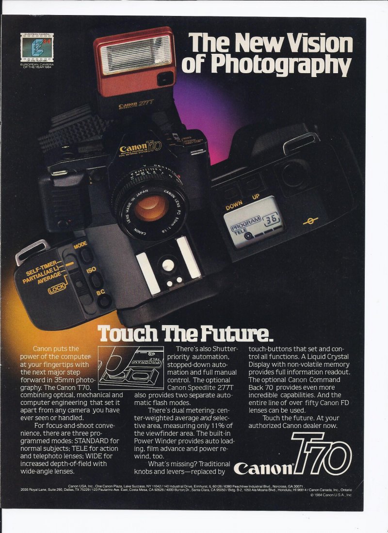 1984 Canon T70 SLR Camera Print Ad Electronics Photography