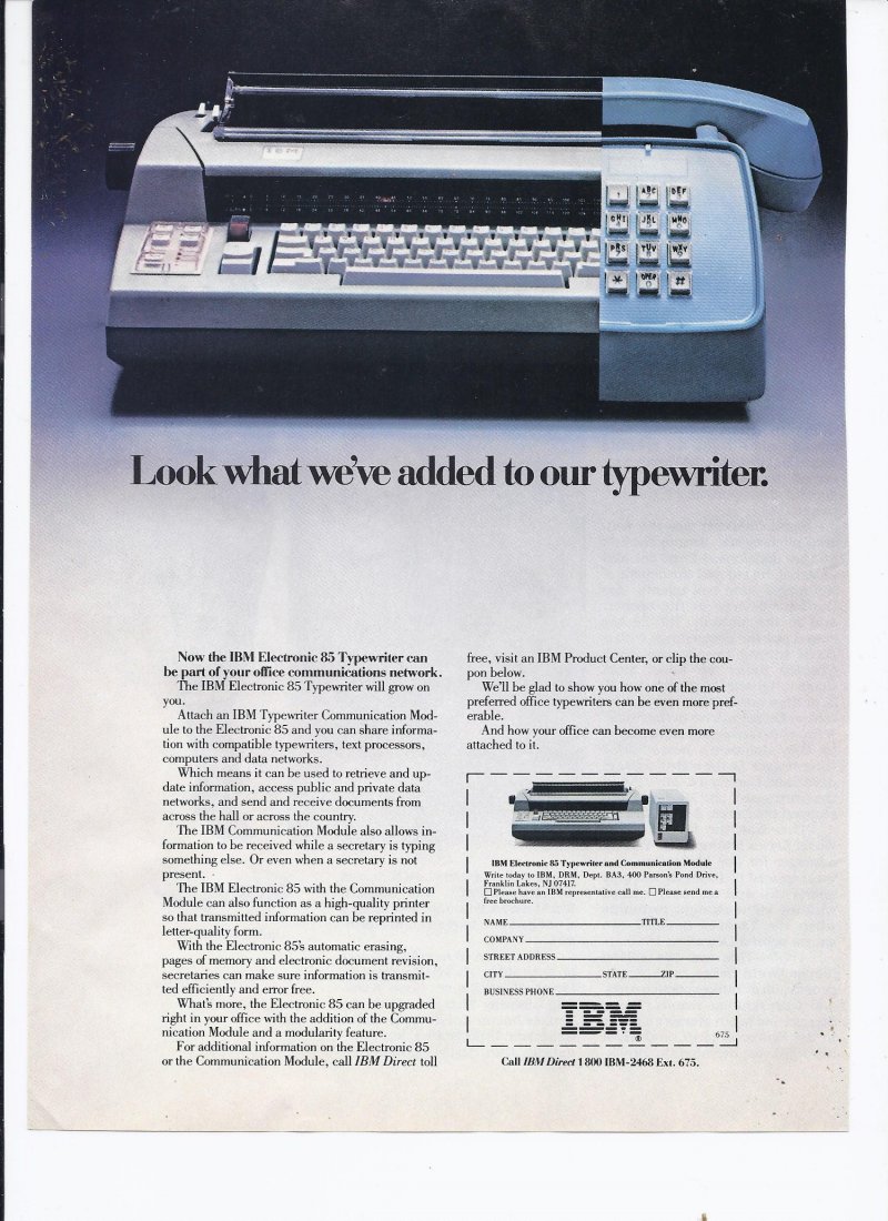 80's IBM Electronic 85 Typewriter and Communication Module Print Ad