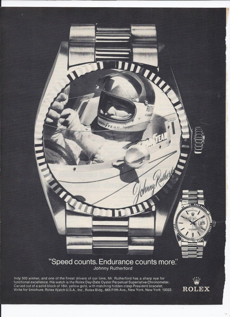 more great Print Ad's @ www.everythingcollectibles.biz for sale is a rare and hard to find 80's Rolex Watch Print Ad Vintage Johnny Rutherford. In good used condition as pictured. Fast same or next day shipping with delivery confirmation within the U.S.