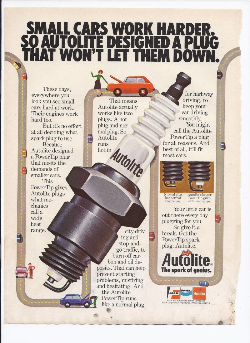 more great Print Ad's @ www.everythingcollectibles.biz for sale is a rare and hard to find 80's Autolite Spark Plug Print Ad Automobile Car. In good used condition as pictured. Fast same or next day shipping with delivery confirmation within the U.S.