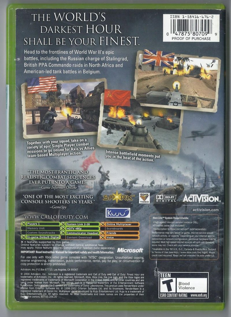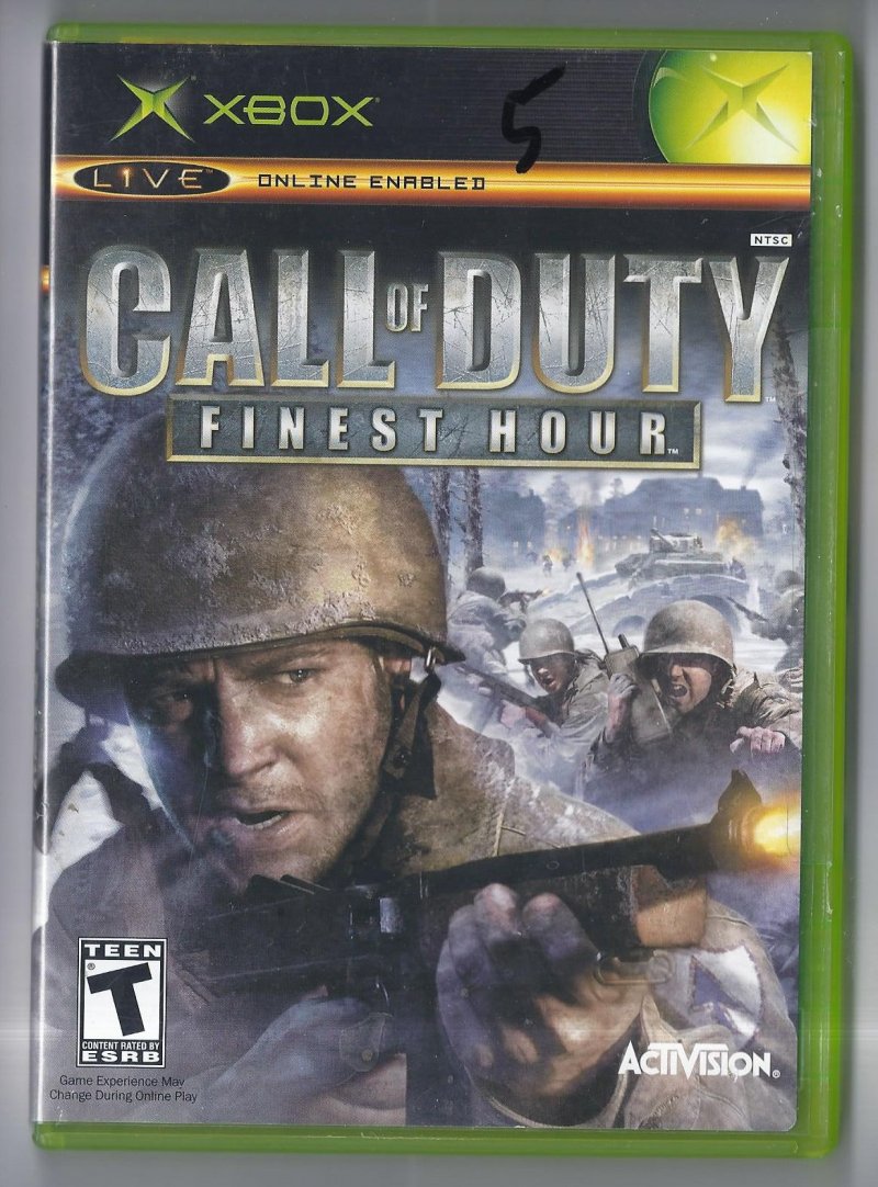 more great Video Games @ www.everything-collectibles.com Call Of Duty Finest Hour video Game Microsoft XBOX CIB. This Video Game is in good used condition as you can see from the picture tested and works. Comes with Case, Cover Art, Instruction Booklet and Disc. if you have any further questions please don't hesitate to ask! if your order is over $50 Shipping is FREEE within The U.S.!!!