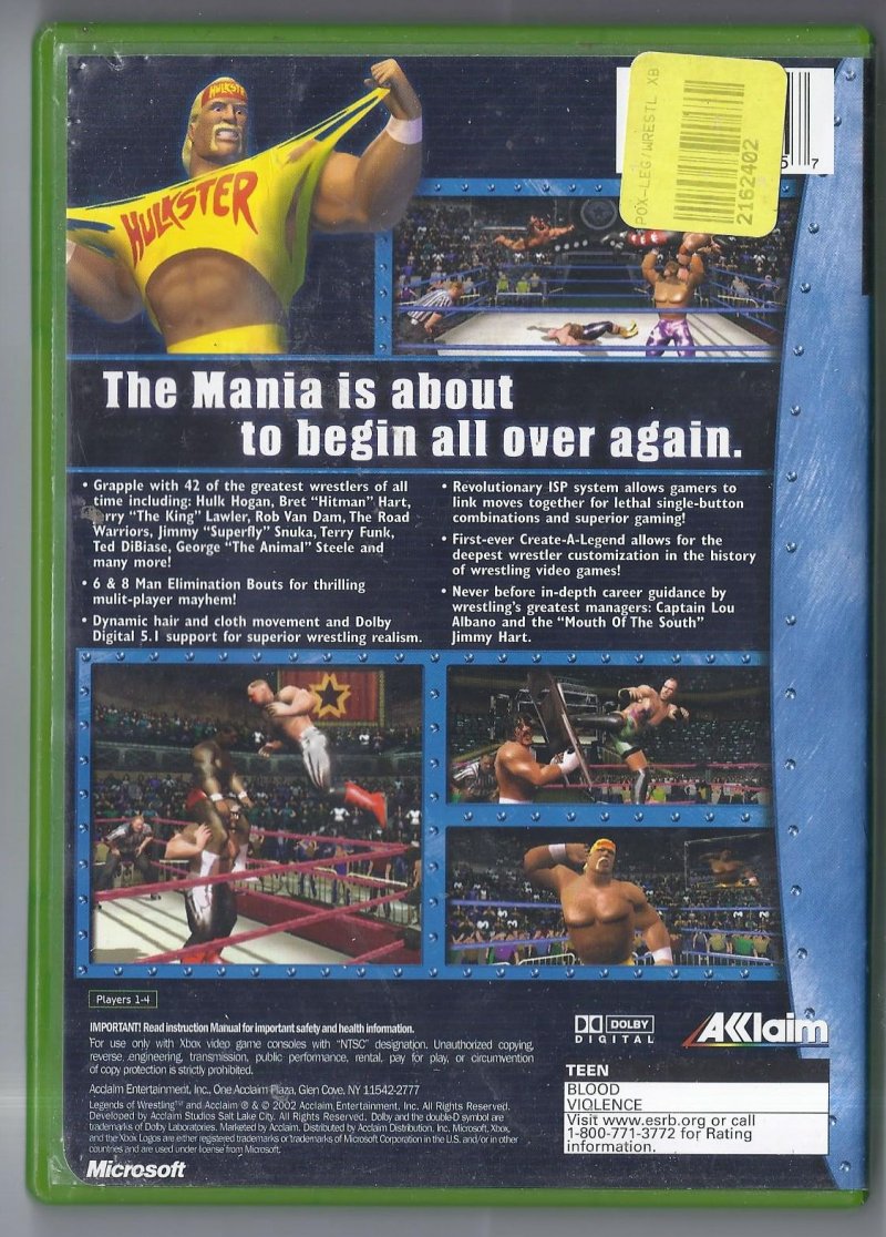 more great Video Games @ www.everything-collectibles.com legends Of Wrestling video Game Microsoft XBOX CIB. This Video Game is in good used condition as you can see from the picture tested and works. Comes with Case, Cover Art, Instruction Booklet and Disc. if you have any further questions please don't hesitate to ask! if your order is over $50 Shipping is FREEE within The U.S.!!!