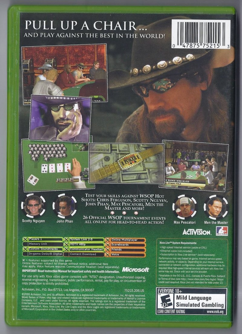 more great Video Games @ www.everything-collectibles.com World Series Of Poker video Game Microsoft XBOX CIB. This Video Game is in good used condition as you can see from the picture tested and works. Comes with Case, Cover Art, Instruction Booklet and Disc. if you have any further questions please don't hesitate to ask! Flat $5 shipping No Matter if you purchase 1 or 100 shipping is only $5 and if your order is over $50 Shipping is FREEE!!!