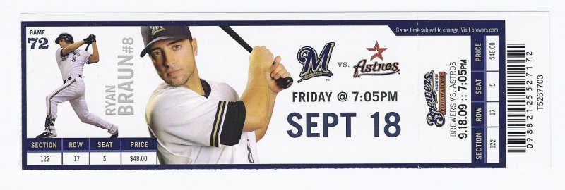2009 Astros @ Brewers Full Unused Ticket September 18th Hoffman Save