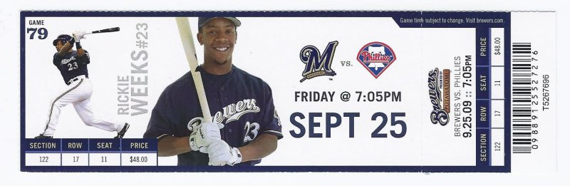 2009 Phillies @ Brewers Full Unused Ticket September 25th Hoffman Save