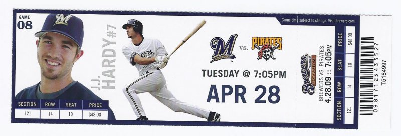 more Great Collectibles @ www.everythingcollectibles.biz For Sale is a 2009 Pirates @ Brewers Full Unused Ticket April 28th Hoffman Save. Its in Good USED condition as pictured. Fast Same Or Next day shipping with Delivery Confirmation. Please don't hesitate to ask any questions.
