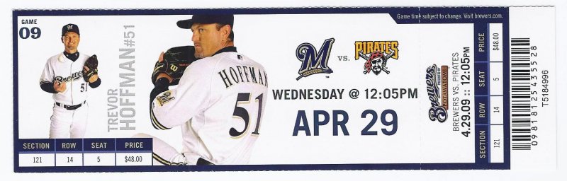 more Great Collectibles @ www.everythingcollectibles.biz For Sale is a 2009 Pirates @ Brewers Full Unused Ticket April 29th 2 hit shutout. Its in Good USED condition as pictured. Fast Same Or Next day shipping with Delivery Confirmation. Please don't hesitate to ask any questions.