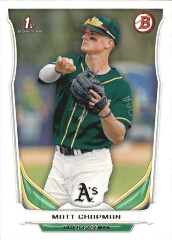 more Great cards @ www.everythingcollectibles.biz For Sale is a 2014 Bowman Draft #DP21 Matt Chapman Card in NrMt Condition. all single cards are shipped in Penny Sleeves and top loaders. all orders ship with delivery confirmation as well. we usually ship within 2 days of receiving an order. Shipping is a Flat $2 no matter how many cards you buy 1 or 1000 its still $2.