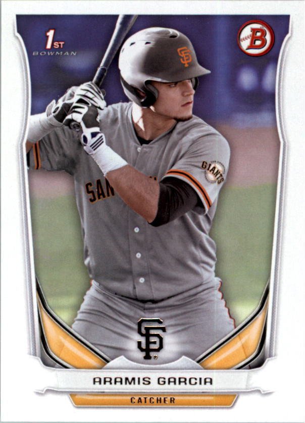more Great cards @ www.everythingcollectibles.biz For Sale is a 2014 Bowman Draft #DP50 Aramis Garcia Card in NrMt Condition. all single cards are shipped in Penny Sleeves and top loaders. all orders ship with delivery confirmation as well. we usually ship within 2 days of receiving an order. Shipping is a Flat $2 no matter how many cards you buy 1 or 1000 its still $2.