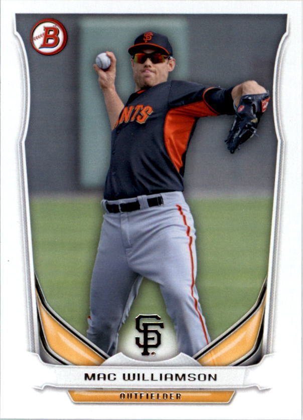 more Great cards @ www.everythingcollectibles.biz For Sale is a 2014 Bowman Draft Top Prospects #TP82 Mac Williamson Card in NrMt Condition. all single cards are shipped in Penny Sleeves and top loaders. all orders ship with delivery confirmation as well. we usually ship within 2 days of receiving an order. Shipping is a Flat $2 no matter how many cards you buy 1 or 1000 its still $2.